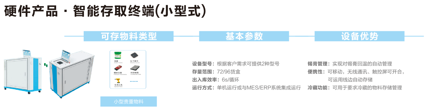 小型一對(duì)一智能存取終端,可實(shí)現(xiàn)對(duì)錫膏回溫的自動(dòng)管理,可移動(dòng),無線通訊、觸控屏可開會(huì),可運(yùn)用線邊自動(dòng)存儲(chǔ)??捎糜谝罄洳氐奈锪洗鎯?chǔ)管理。