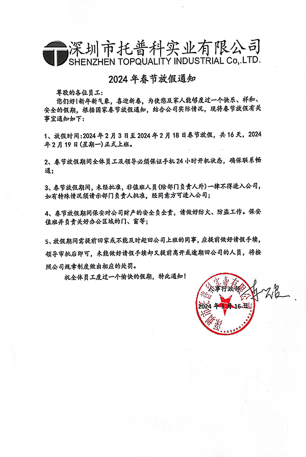 深圳市托普科實(shí)業(yè)2024年春節(jié)放假通知
