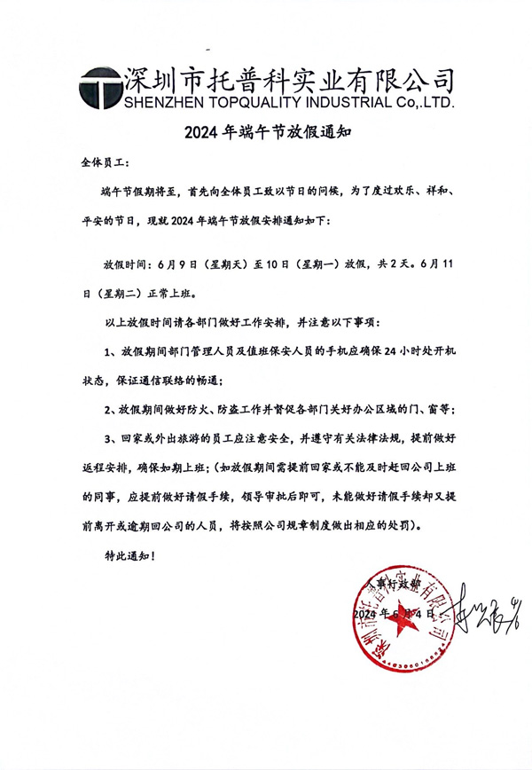 端午節(jié)假期將至,首先向全體員工致以節(jié)日的問候,為了度過歡樂、祥和、平安的節(jié)日,現(xiàn)就 2024年端午節(jié)放假安排通知如下: