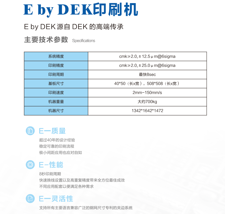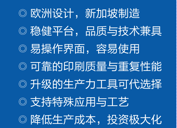 Eby DEK印刷機(jī),歐洲設(shè)計(jì),新加坡制造。穩(wěn)健平臺,品質(zhì)與技術(shù)兼具,易操作界面和容易使用??煽康挠∷①|(zhì)量與重復(fù)性能。