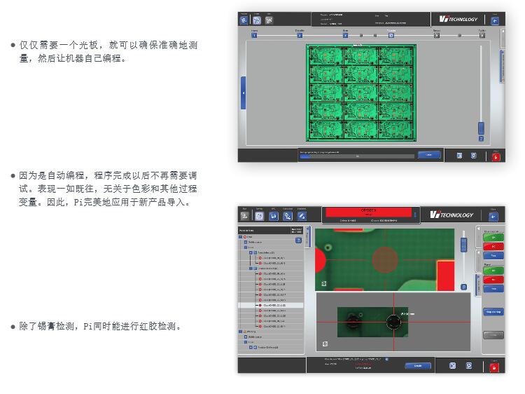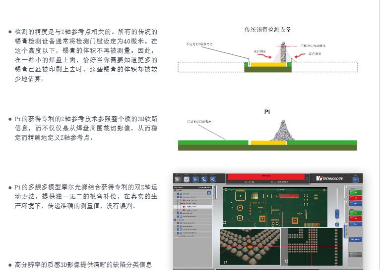 VI 3D錫膏檢測設備 PI Series 1. 自動編程可用于新產(chǎn)品的檢測 2. 除錫膏檢測外PIE也可進行固定膠檢測 3. 通過面積區(qū)域比率可實現(xiàn)自動分焊盤 4. 3D超大圖像檢查更便于使問題判斷 5. 通過SIGMA分析技術,離線SPC,嵌入式 SPC 實現(xiàn)實時程序監(jiān)控